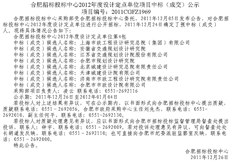 合肥招標投標中心采購部受合肥招標投標中心委托,2011年12月05日發(fā)布公告,對合肥招標投標中心2012年度設計定點單位進行公開招標。我院道橋三所成功中標。