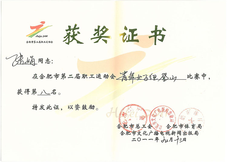 2011年9月13日上午,合肥市第二屆職工運動會登山比賽在合肥市大蜀山舉行,我院派出了6名運動員參加比賽。其中,我院市政景觀所的張娟同志發(fā)揮了敢闖敢拼的精神,在70多人參加的女子青年組的比賽中,獲得女子青年組登山比賽第8名。